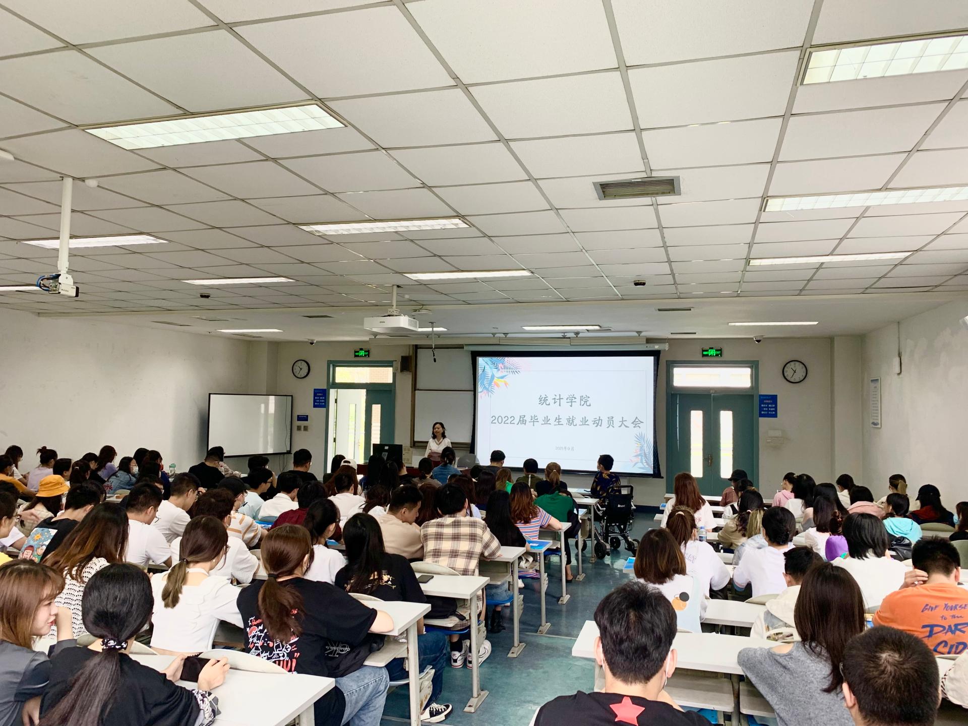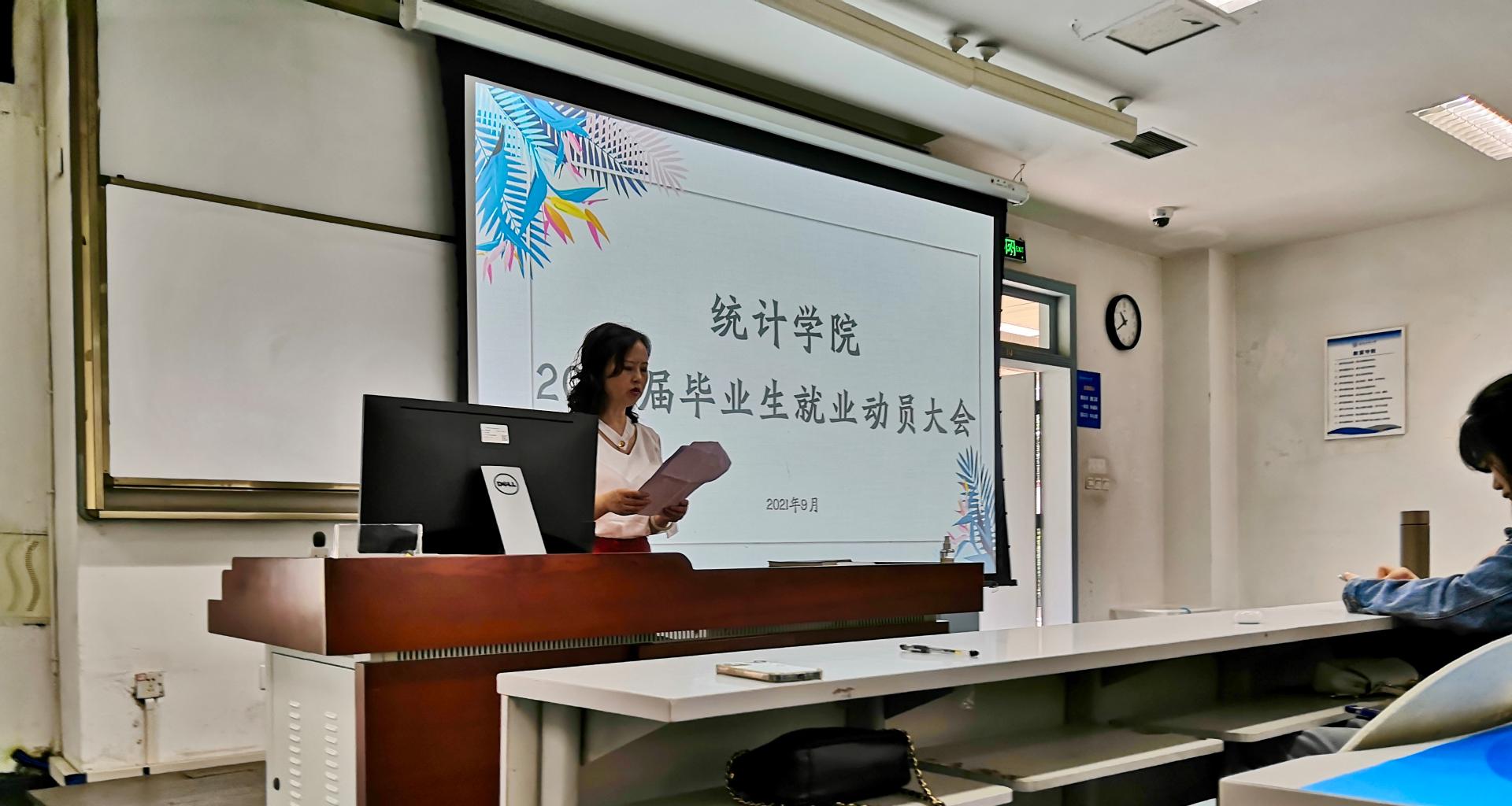 2021年9月27日上午,统计公司在经世楼F102召开了2022届毕业生就业动员大会,统计公司分党委副书记彭晓蓉、毕业班辅导员、教学秘书参加了此次会议。会议由毕业班辅导员甘筑夏主持。