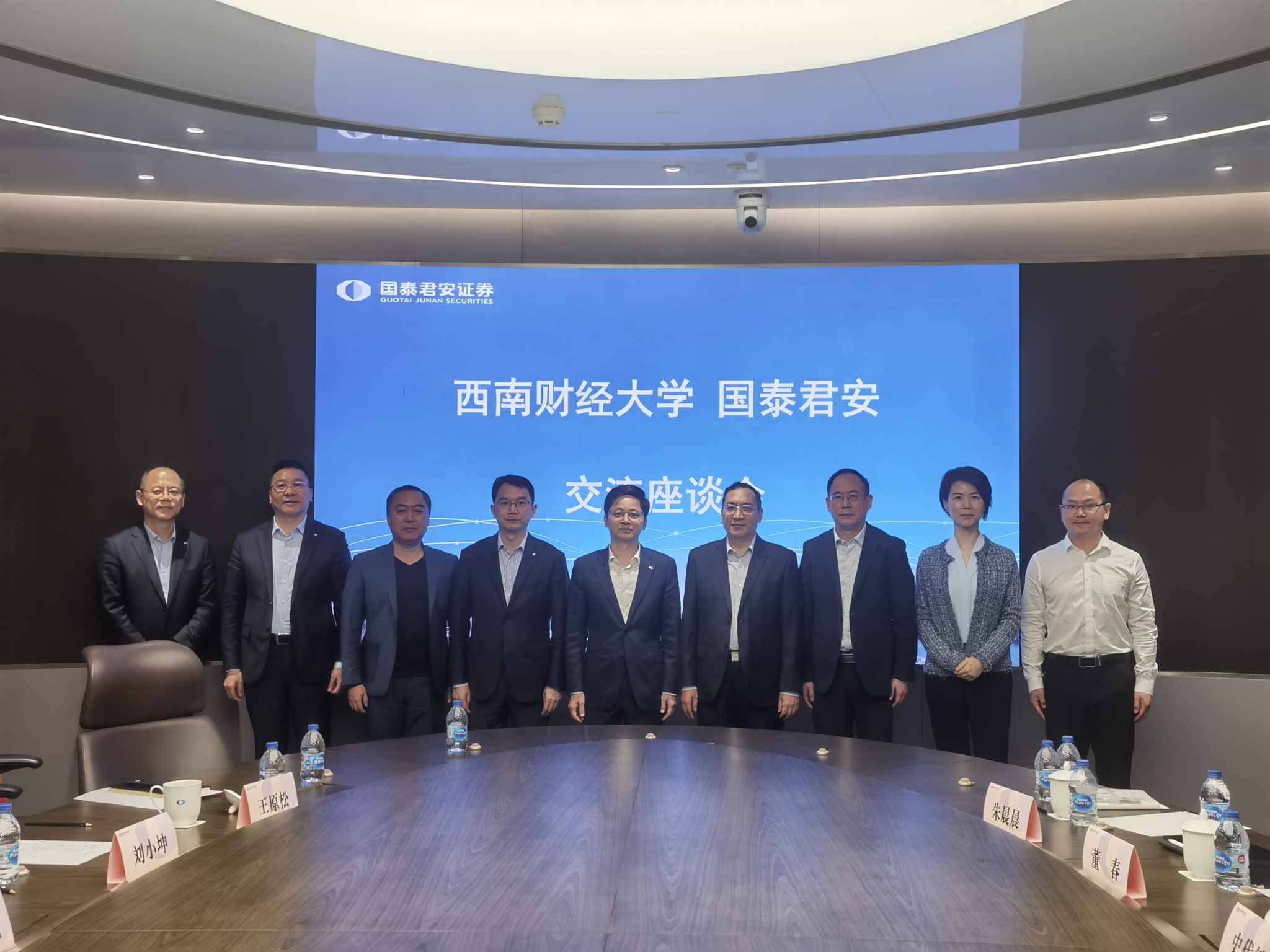 国泰君安证券总裁李俊杰、人力资源部总经理刘小坤、金融公司经理黄燕铭、投行事业部副总裁金利成、投行事业部人力资源总监刘嘉等领导参与座谈。会上,史代敏首先感谢企业长期以来对于公司发展的大力支持,表达此次拜访的重要背景和因素。用“百年西财”、“新财经”、“产教融合”三个关键词介绍了公司历史沿革、学科发展、校企合作的情况。