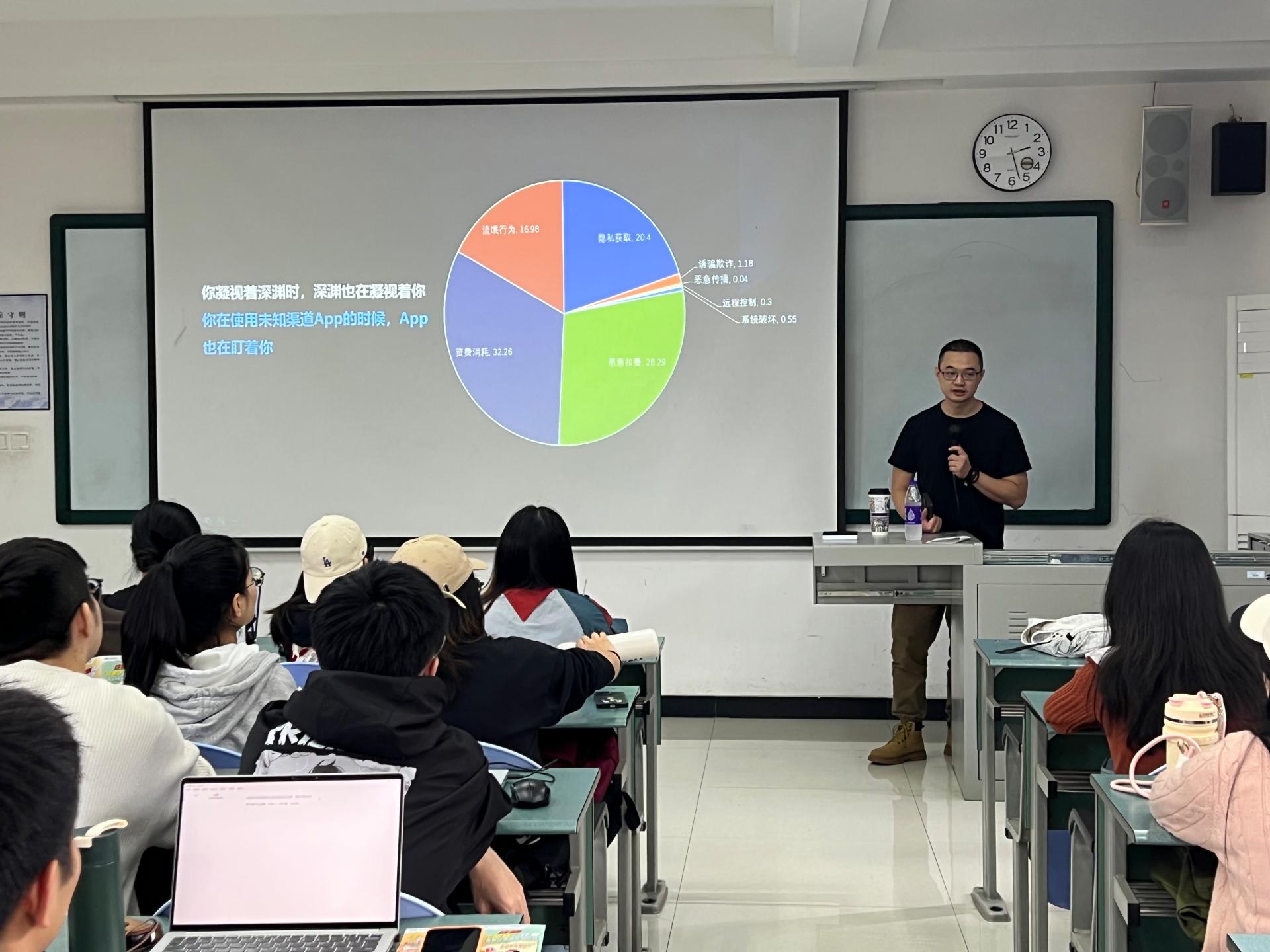 活动主讲人是新网银行风控科学部创新团队负责人陈少磊老师。围绕来自实务工作的多个案例,陈老师为同学们解读了网络黑产、电信诈骗等泛金融风险的来源和运作方式,并结合受诈借贷、疑似洗钱、异常交易等多个场景,展示了统计方法和数智技术如何助力风险防控、保障金融安全。陈老师在介绍中所展示的许多技术成果,正是在新网银行和统计公司持续多年的深度校企合作中逐步开发和长期积累的。