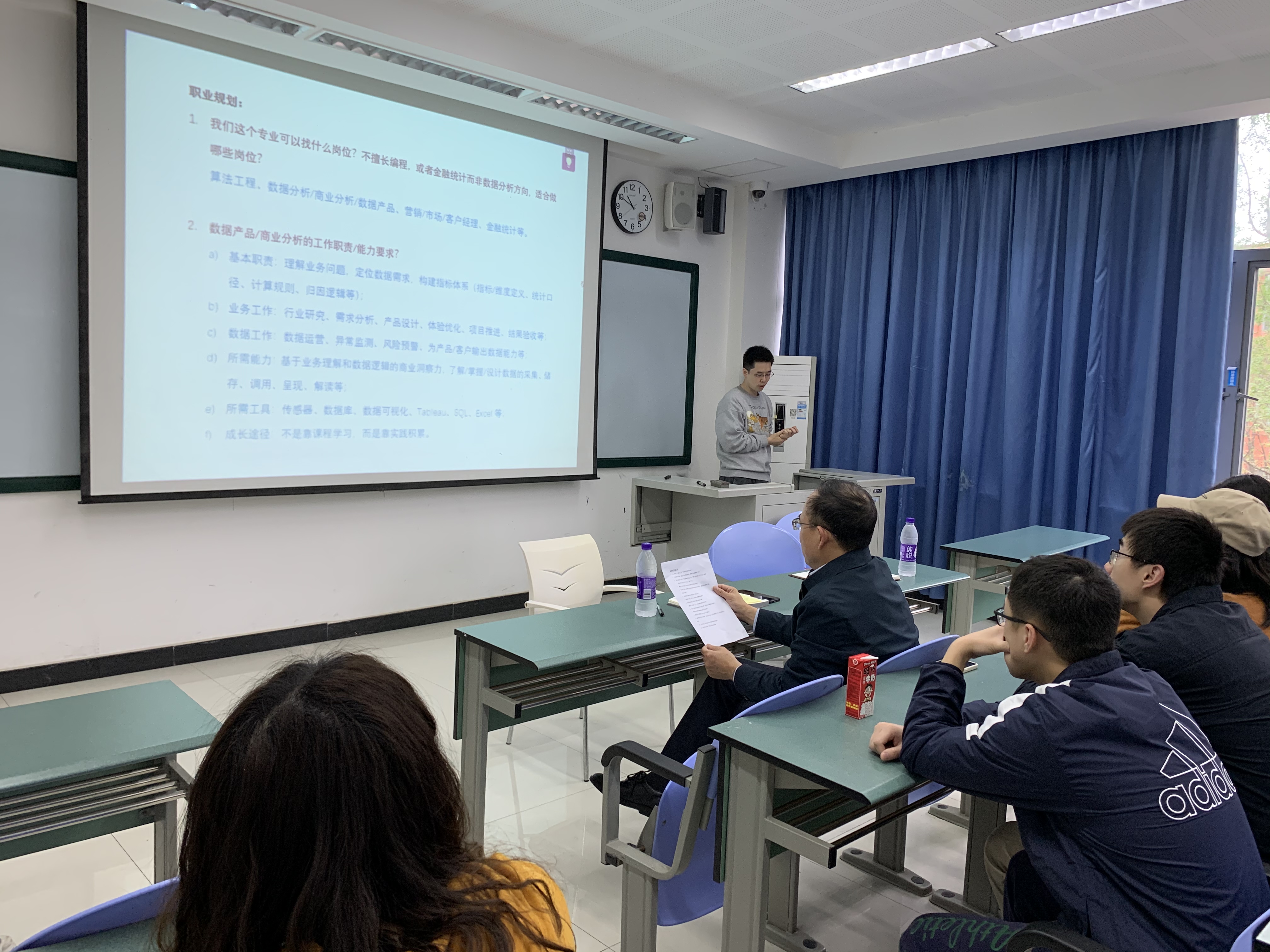 在提问环节,针对同学们提出的行业实习与专业学习的重点偏向、数据分析师专业技能掌握程度、如何通过参加学科竞赛丰富自己的个人简历、银行信息科技岗的工作职责、秋招面试的应对准备等问题,公司领导和老师结合自身学习科研经历和行业兼职经验进行了详细的解答,强调同学们应制定符合自身实际的专属培养方案,通过公司的专业实践基地、联合培养项目提升就业竞争力,期望大家珍惜在公司的学习、实践机会,通过多重渠道认识世界、积累经验和认知自己,在不断的尝试中实现对自身的迭代、更新、优化。