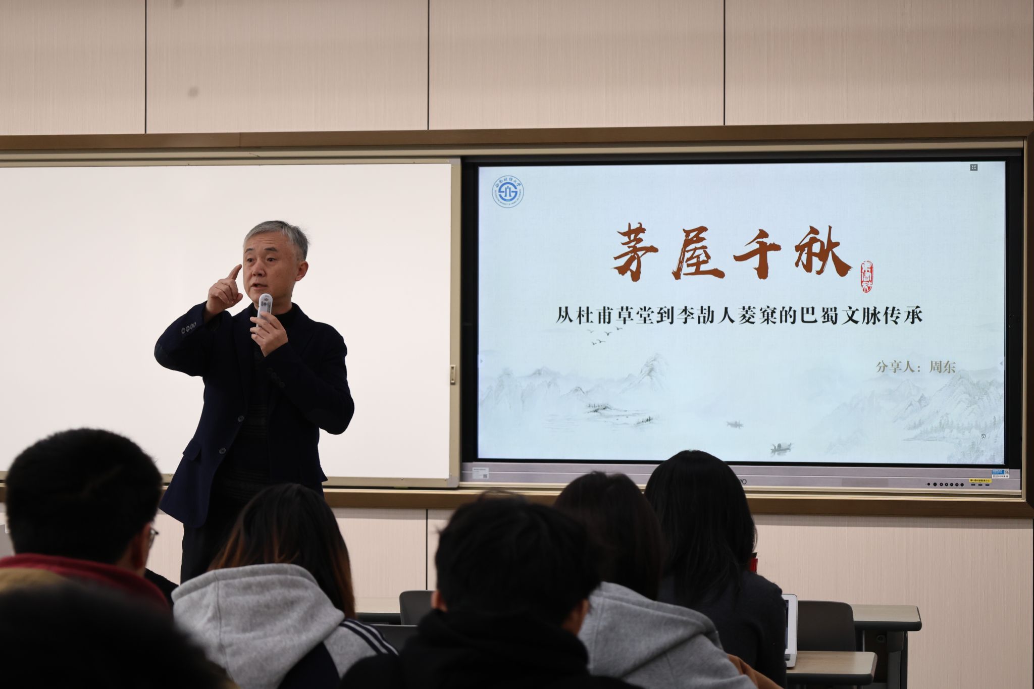 周东以成都方言开篇,从浣花溪畔的杜甫草堂讲起,深入解读杜甫在此如何将个人际遇升华为“大庇天下寒士俱欢颜”的博大情怀,使草堂成为后世景仰的精神象征。随后,他将视线转向狮子山下的菱窠,生动阐述李劼人先生在此以“大河三部曲”等鸿篇巨制,为近代四川社会变迁描绘出的壮阔史诗。两座“茅屋”跨越千年,共同勾勒出巴蜀文脉的深厚底蕴与不屈韧性。讲座最后在师生齐诵《双茅诗》的悠扬韵律中圆满结束。