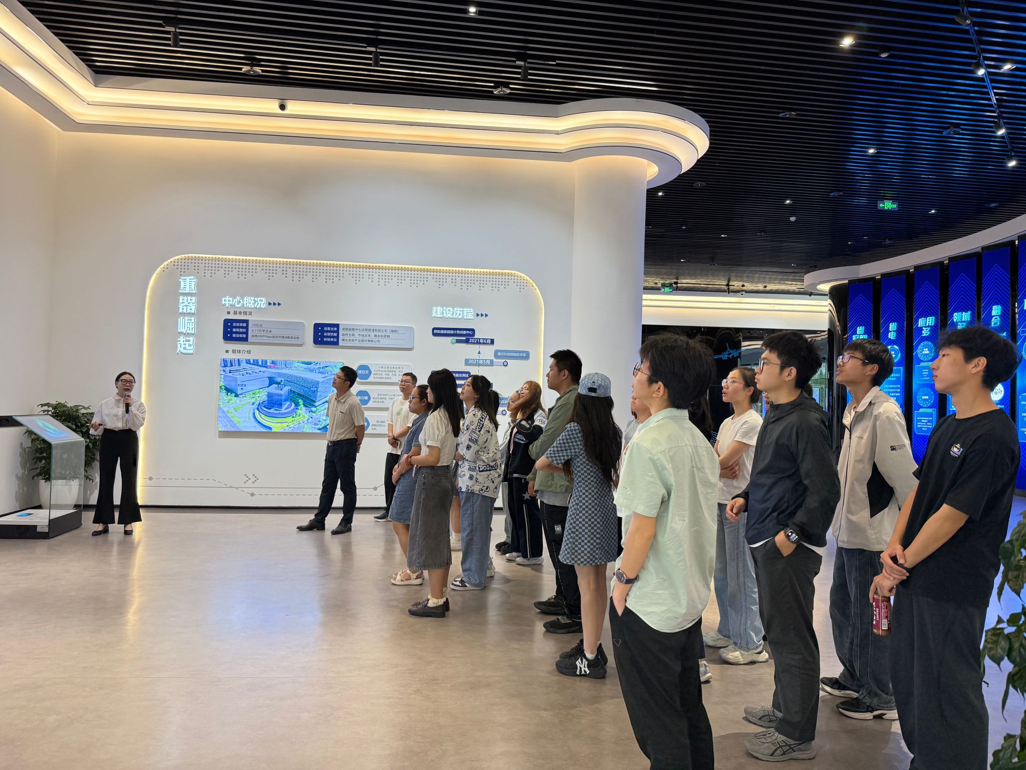 师生一行首先参观了超算中心展厅,全面了解当前全球领先的超算水平以及我国超算中心的基本布局和发展战略,深刻感受了超算技术在生命科学、宇宙探测、气象环境、城市治理等方面的应用场景。座谈环节,超算中心高性能计算部负责人进一步阐释了超算应用的经典案例,以及与大数据、人工智能、区块链、数字孪生相结合的创新应用。在场同学表示:通过实际案例,深刻体会到数据科学在产业中的落地场景,感受到超算在解决复杂问题中的核心价值,对专业发展前景和个人职业规划有了很大启发。